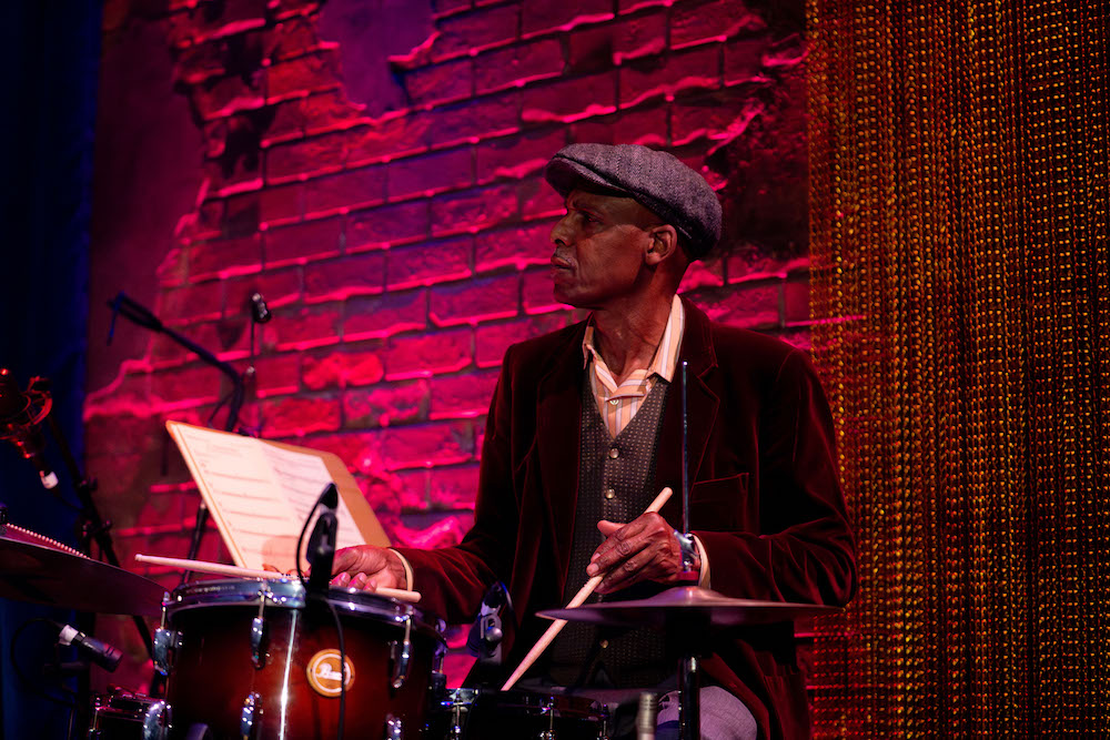The set design by Ailsa Paterson totally convinces as a jazz dive, with a clean stage area in front of crumbling brickwork and lampshades covering of the theatre’s lights.