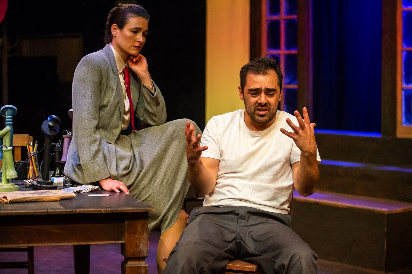 The play is set exclusively in the newsroom, with lots of entry/exit through a door at the rear, and off-stage action taking place through a window. The set is fairly sparse and static: a roll-top desk, a simple table and chairs, a window cut into a flat on one side of the stage.Â