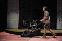 The set by James Browne is simple, switching easily from a lounge room to the front yards of two neighbouring houses, to a variety of other incidental locations. At the centre of the stage is a revolving door that is used to help effect scene changes as well as act as a semi-transparent screen in certain situations.