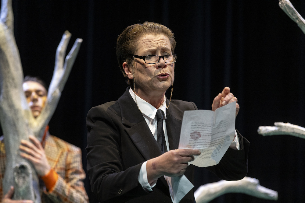 Set designer Charles Davis has kept the staging simple by employing a simple but highly effective scrim to differentiate between the inside and outside worlds, while a bare tree stump becomes the main onstage prop, along with an old upright piano which is used effectively by Feste and Malvolia.